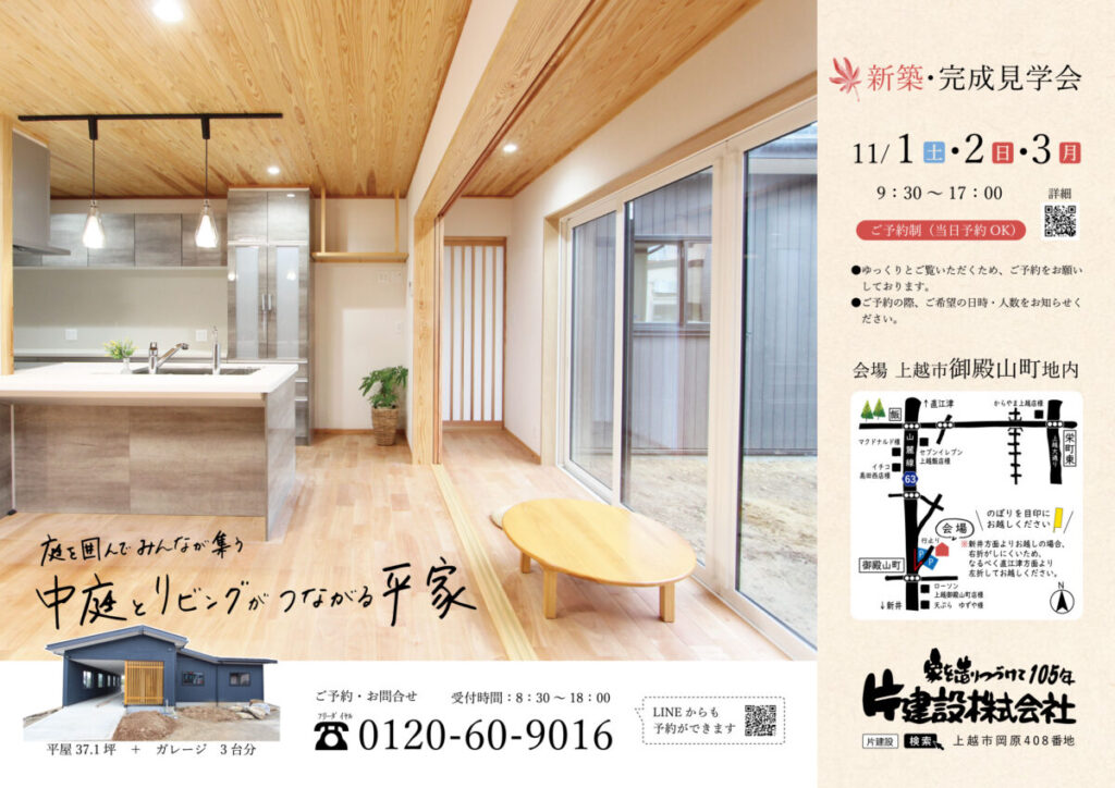 11月1日(土)・2日(日)・3(月祝)に上越市内にて「中庭とリビングがつながる平屋」完成見学会を開催致します。