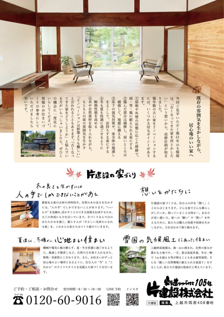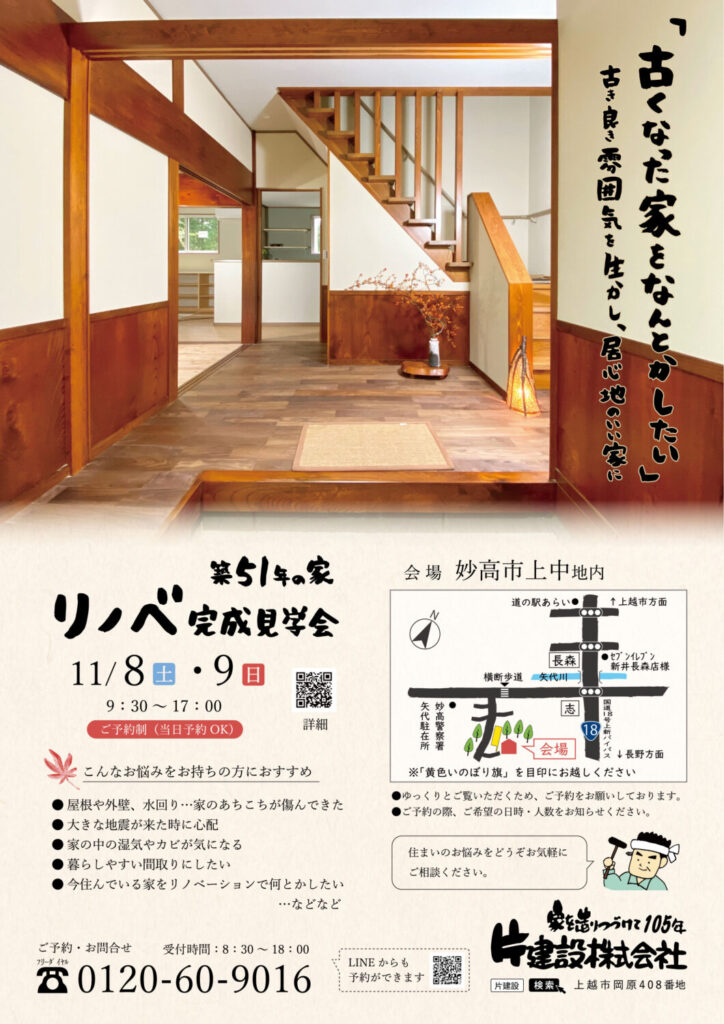 11/8(土)・9(日)に妙高市上中地内で築51年の家のリノベ完成見学会を開催します。