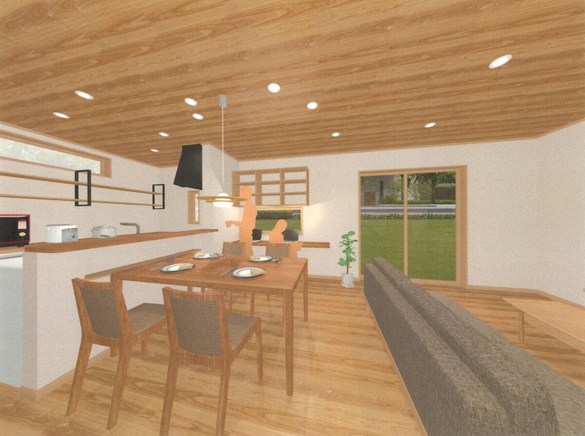 のどかな田園風景を見渡せるLDKで、コーヒーを飲みながらのんびりと本を読んだり、デスクワークをしたり…時間がゆったりと流れていくような杉のぬくもりが心地いい家。
