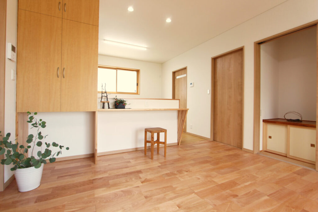 階段の上り下りが不要な、暮らしやすさを追求したコンパクトな平屋の住まい。屋根の高さを抑え、雪下ろしの負担も軽減しています。カーポートから雨や雪に濡れずに玄関へ入れる動線も安心です。日当たりと風通しの良いリビングには、足触りの心地よい桜の無垢床を採用。廊下を設けず、リビングから各部屋へとつながるワンルーム型の間取りは、家中の温度差が少なく快適です。玄関からすぐにキッチンへ行ける家事動線や、寝室近くのトイレ、必要な場所に設けた収納など、暮らしに寄り添う工夫が随所に。猫が自由に行き来できるくぐり戸や専用スペースも備え、人にも猫にもやさしい家です。